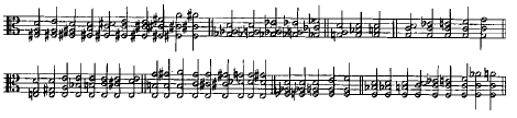 G-D-A현에서 가능한 삼중음들도 C-G-D현에서의 삼중음들은 악보화한것과 같은 방식으로 표시될 수 있다. 위의 삼중음들은 모두 제1포지션에서 가능하며 모든 어색한 삼중음들은 삭제한 것들이기 때문에 어렵지 않게 연주될 수 있을 것이다.