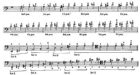 첫째 손가락과 네째 손가락을 벌리면 하위 포지션에서는 장2도 음정을 낸다. 일반적으로 세째 손가락은 독립적으로 사용되지는 않으나 네째 손가락과 함께 현위에 항상 위치하며 이러한 쓰임은 제5포지션까지 해당된다. 따라서 첫째, 둘째, 네째 손가락이 운지에 사용되며 제7포지션 이후에는 엄지까지도 사용된다.