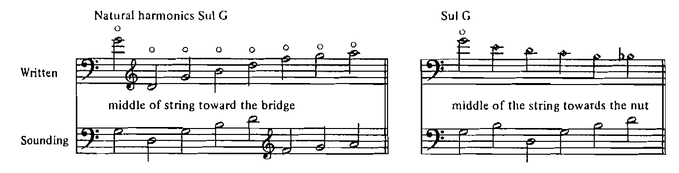 앞서 언급했듯이 오직 자연적 하모닉스만이 더블 베이스에서 가능하며 이것들은 매우 효과적이다. 아래에는 비교적 쉽게 얻을 수 있는 하모닉스들이 제시되어 있다.