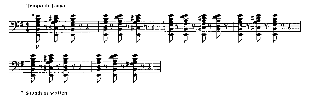 여기에서의 모든 현들은 기보된 것보다 한 옥타브 낮게 연주된다.