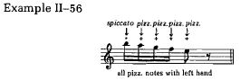 이 주법은 관현악 작품에서 보다는 독주곡이나 실내악 작품에서 활신 많이 사용된다. 십자가 모양 표시가 있으며 왼손의 손가락으로 현을 뜯어 연주하게 된다. 종종 개방현일 경우가 많으며 또 흔히 새끼손가락으로 뜯어 연주한다. 그외의 경우에는 일련의 음들이 왼손가락에 의해 피치카토로 연주되기도 하는데 이러한 경우에는 아래와 같은 방법으로 가장 높은 음을 연주하는 손가락이 다음 높은 음을 뜯어 연주하게 된다.